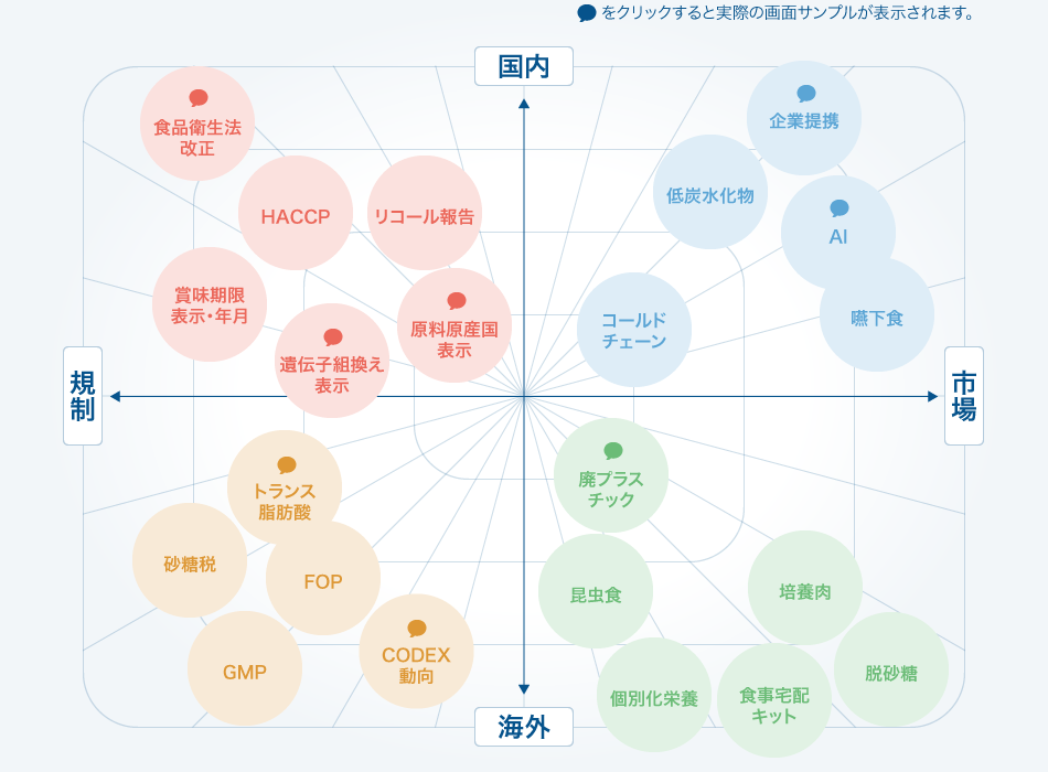 最新の食品業界動向トピックや課題、成分、技術について、国内、海外の様々な情報を監視し、ライブラリ化。