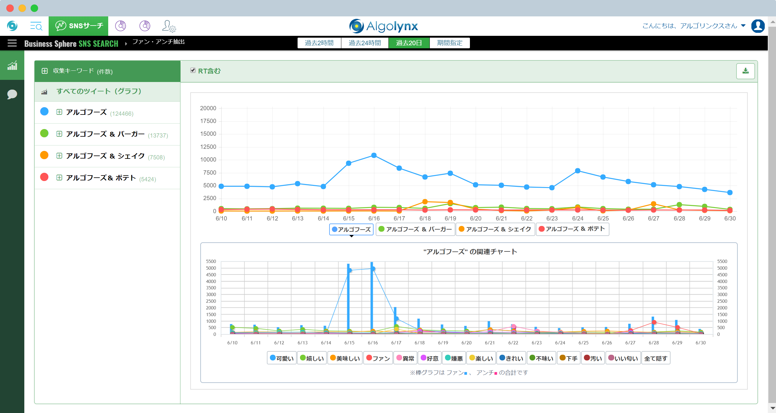SNS投稿内容をリアルタイムにテキストマイニングし、頻発する単語、単語の相関性などをトレンドグラフでビジュアルに表示。グラフの気になる単語から詳細な投稿内容を参照することも可能。