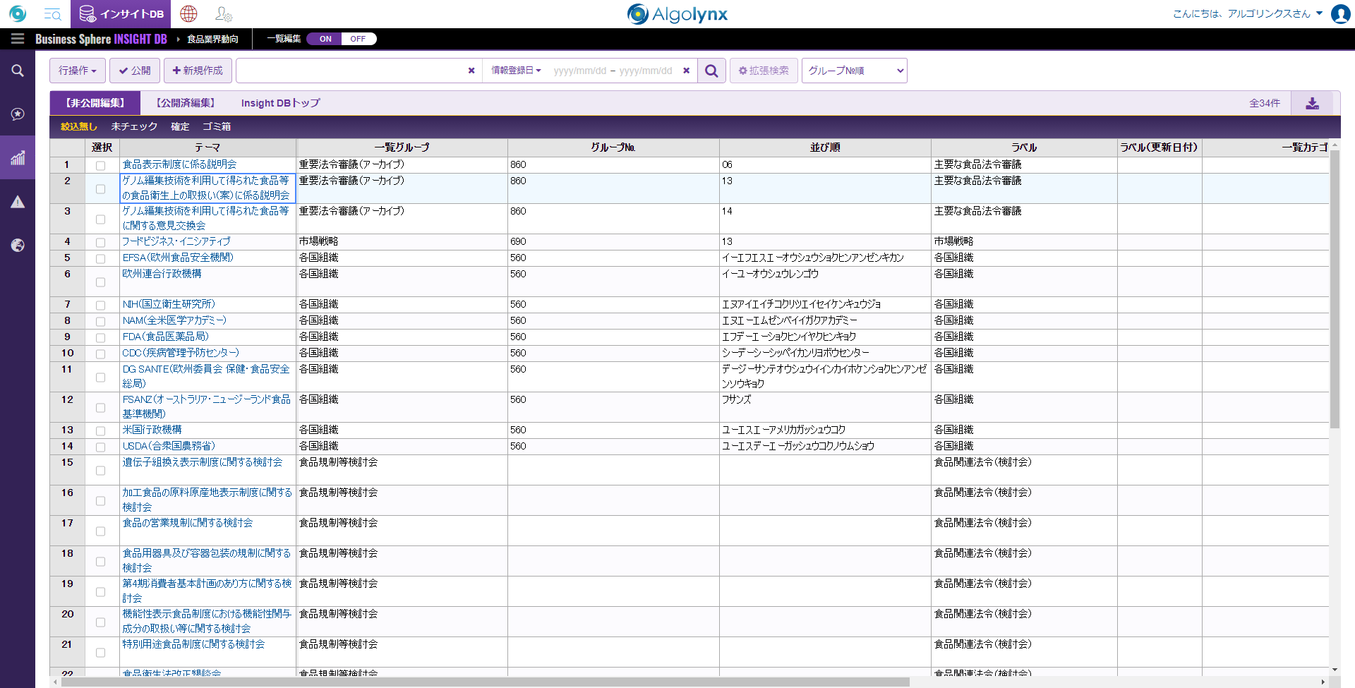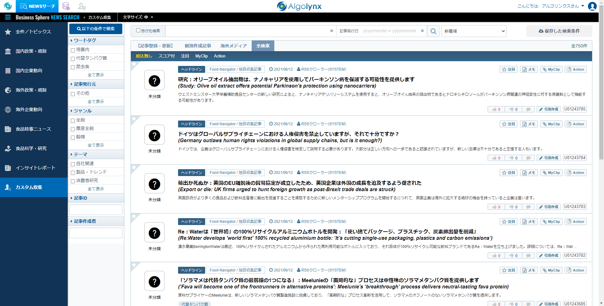 Algolynx Business Sphere®では、国内外の規制・政策、市場・企業、研究、あるいは独自収集の情報など
